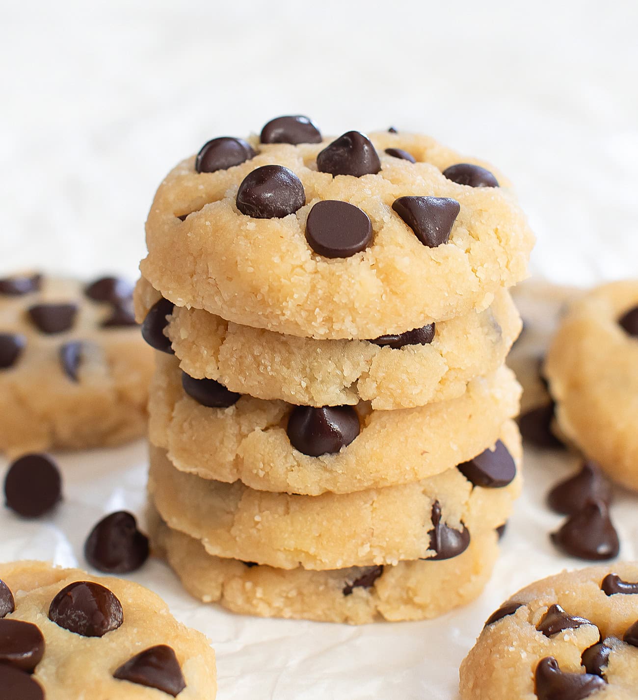 Use a 1.5 tablespoon cookie scoop to scoop the dough. Pack the dough into the scoop before releasing to help it stick together. Release onto your prepared baking sheet, spacing each dough ball about 1.5 inches apart. Use the back of a metal spoon to flatten each dough ball until it becomes a thick round disk, about 1/2 inch thick. The cookies will not change shape, so shape or smooth the edges to how you want the final outcome to be. If desired, you can also press a few more chocolate chips on top of each cookie to make them look nicer.