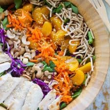 In a large bowl, combine the spinach, romaine, oranges, chow mein noodles, cabbage, carrots and green onions. Top with the chicken, cashews and sesame seeds. Add the remaining marinade and toss to coat. Serve immediately.