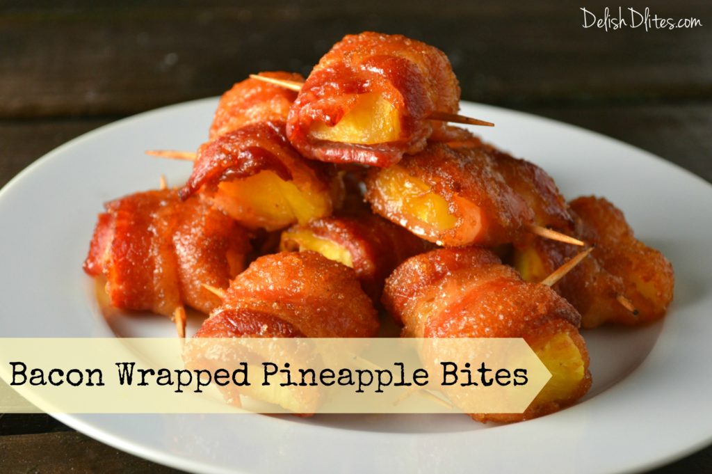 Wrap each piece of pineapple with a piece of bacon and secure with a toothpick. For thick cut bacon, 1/3 of a slice is enough. For regular bacon, use 1/2 of a slice for each piece of pineapple.