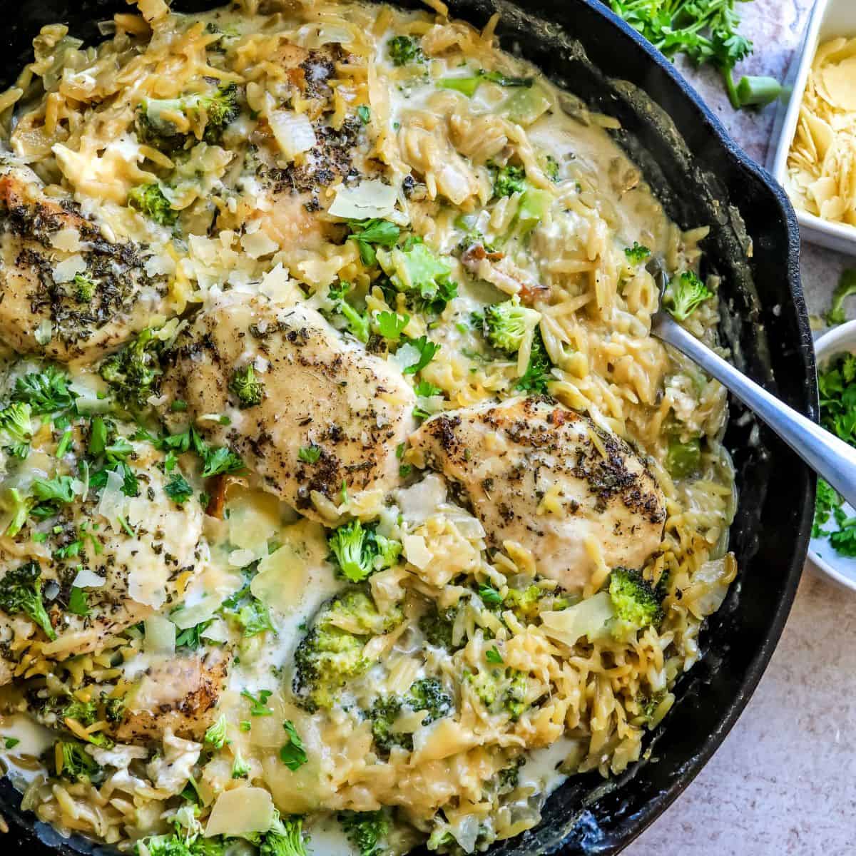Add the orzo to the onions and let it brown for 2 minutes. Add the broth in slowly and stir. Add the cream cheese all around the pan in blobs. Add in the chopped broccoli and bring the liquid to a simmer. Stir in half the parmesan cheese and milk. Return the chicken to the skillet, nestling it around the orzo.