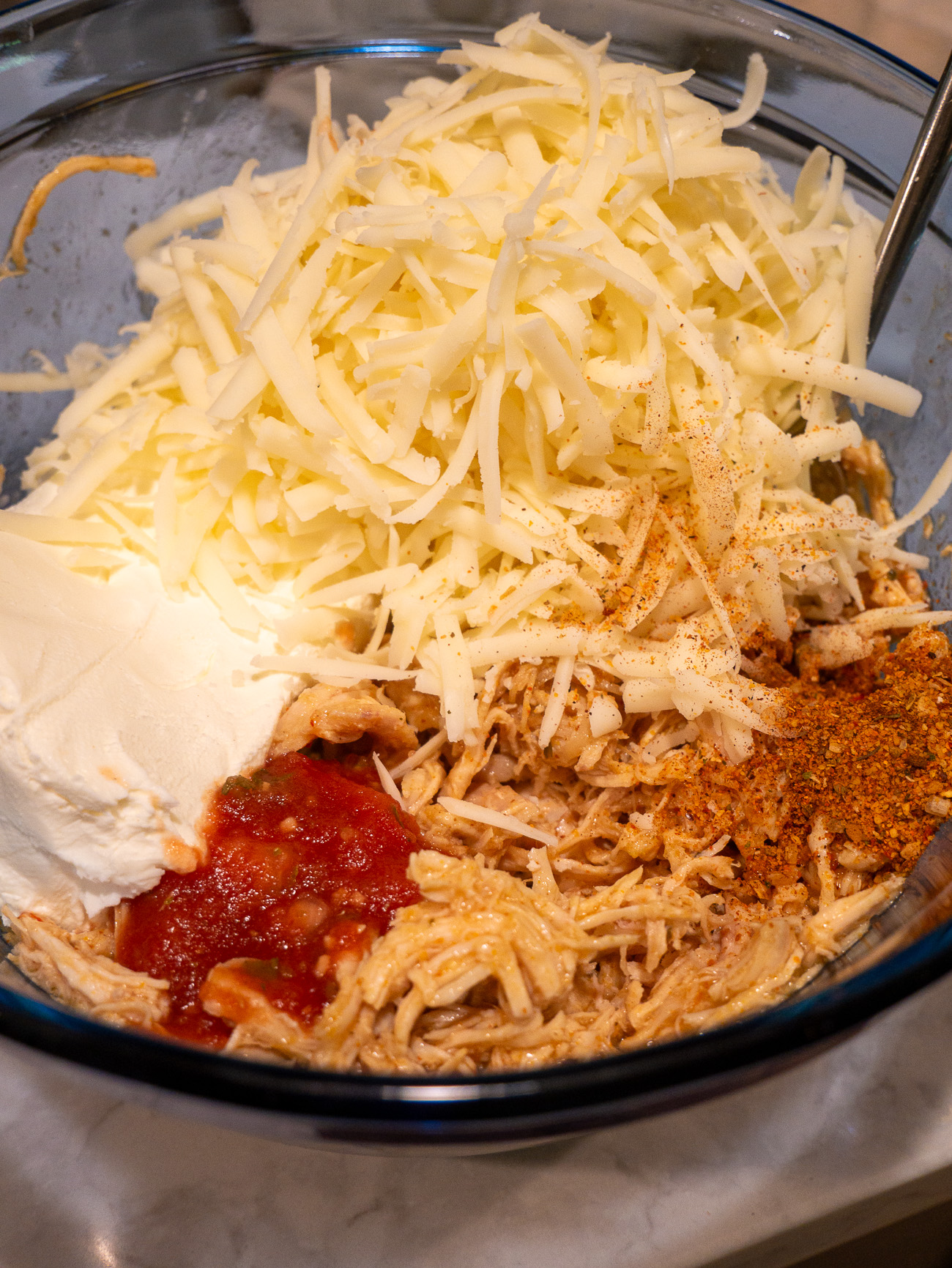 In a medium bowl, combine chicken, cheese, cream cheese, chili powder or taco seasoning, and salsa. Stir to combine, then season to taste with salt and pepper.