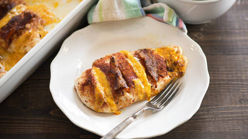 Sprinkle barbecue seasoning all over chicken. Cut bacon slices into thirds to make 6 pieces. Cut Cheddar slices into fourths to make 12 pieces.