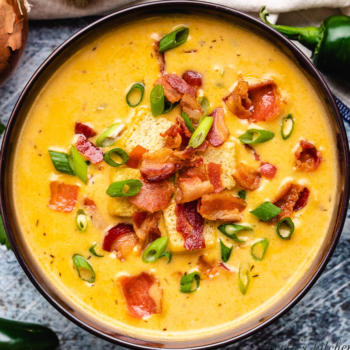 A savory beer cheese soup flavored with pale ale, sharp cheddar and pepper cheeses along with bacon, jalapenos, paprika, and garlic.