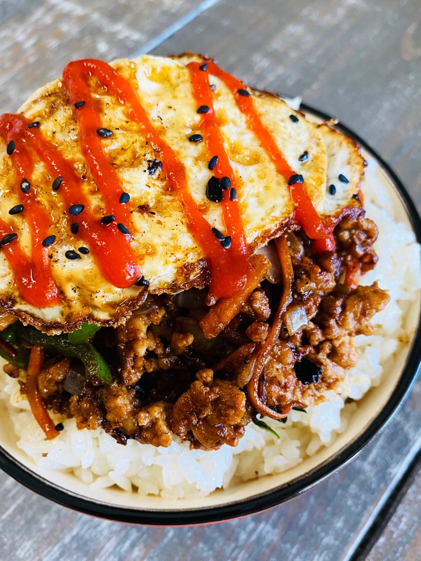 Serve the chicken over rice and top each rice bowl with a fried egg. Add sriracha, sesame seeds, and/or yum yum sauce if desired.