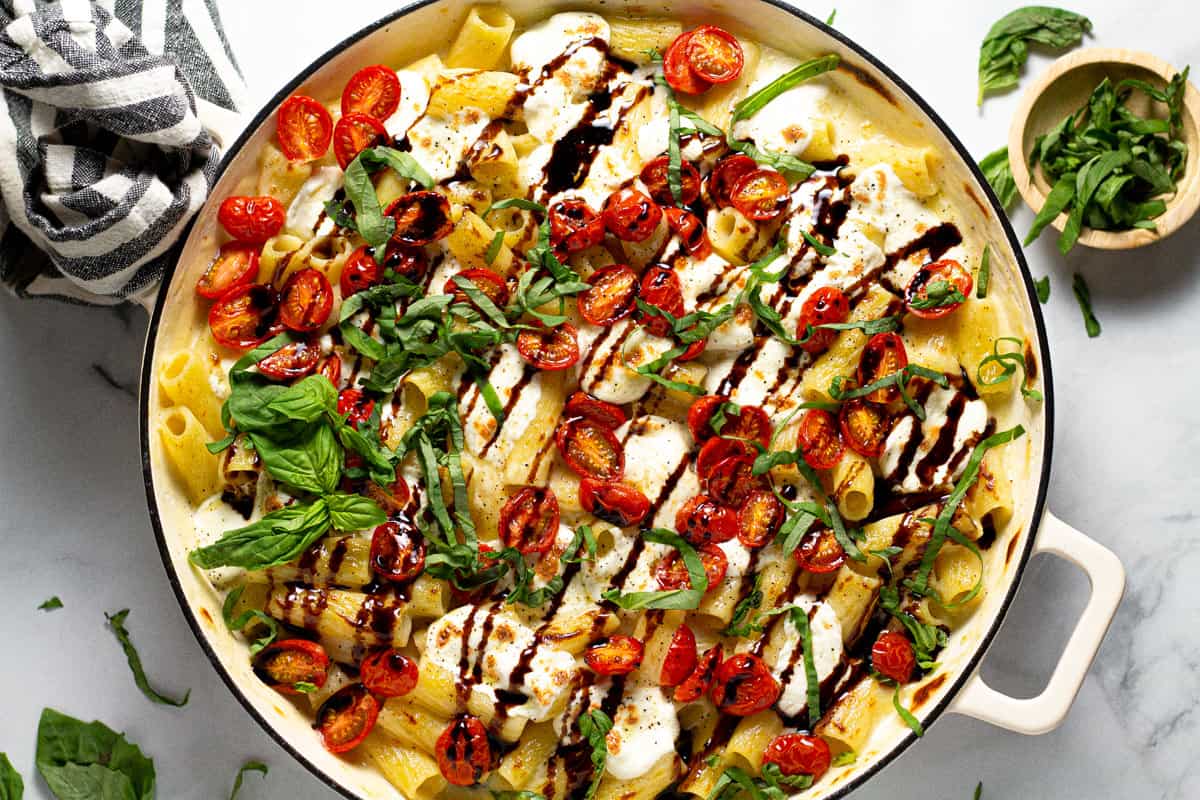 25 minutes and 10 ingredients is all it takes to make this Caprese mac and cheese - the perfect twist on a tried and true classic family dinner! It's loaded with sharp white cheddar, shredded Parmesan and fresh mozzarella along with grape tomatoes, fresh basil and balsamic glaze!