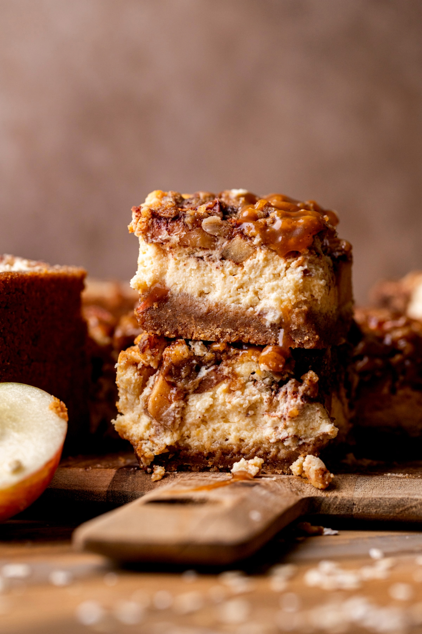 These caramel apple cheesecake bars are perfect for fall! They have a graham cracker crust, creamy cheesecake, cinnamon apples, oat cinnamon streusel, and salted caramel!