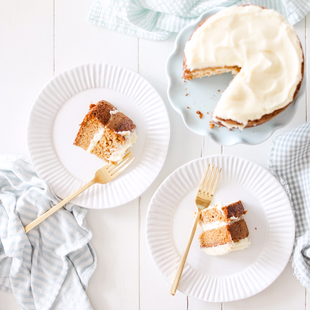 This moist and delicious carrot cake is a breeze to put together and is SO GOOD! You can bake it in a bundt pan or in two 6" or 9" pans to make a layer cake, but it also makes perfect muffins! Double the icing if you are making a layer cake.