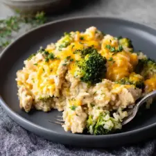 This Cheesy Broccoli Chicken and Rice Casserole is a comforting one-pan meal that combines tender chicken, fluffy rice, vibrant broccoli, and gooey cheddar cheese for a delicious family dinner.