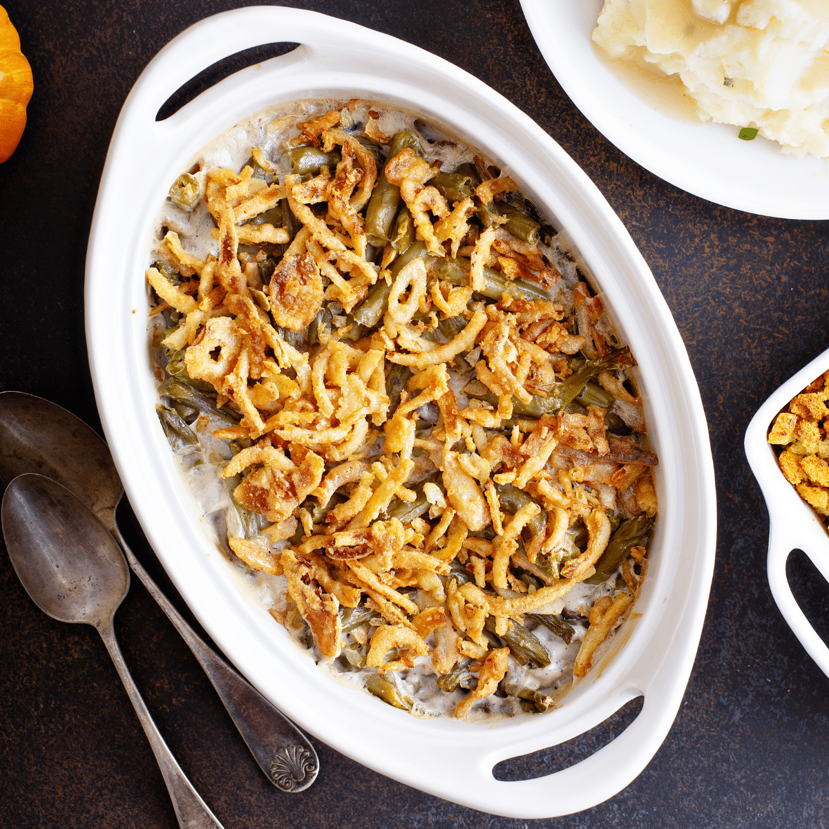 This simple and easy green bean casserole uses cream soup, cheddar cheese, and french fried onions to make the ultimate comfort food for holiday meals or any time of year!