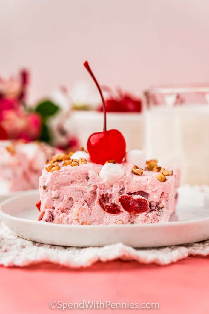 If freezing, spread the cherry salad into a 9x13 inch baking pan lined with parchment paper. If you'd like to eat this as a soft fluff, refrigerate at least 4 hours. Top with additional nuts for garnish if desired.