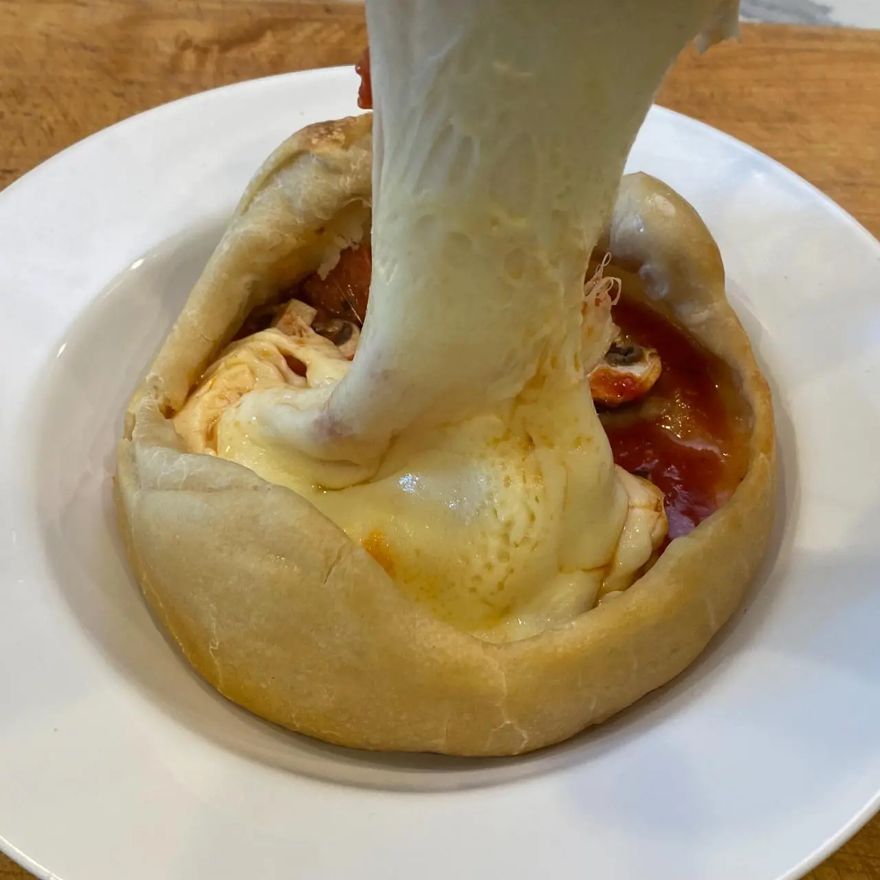 Spray the insides of four ovenproof bowls or crocks with plenty of cooking spray. Shingle 6 to 8 slices cheese inside each bowl so the bottoms touch. This creates the coveted cheese bowl effect. Place 3 to 4 mushrooms on top of the cheese. Then ladle about 1/2 cup COOLED pepperoni sauce over the mushrooms.