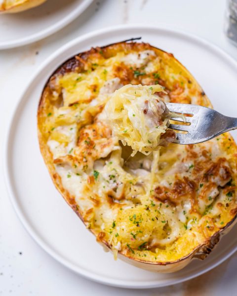 Use a fork to lightly scrape and loosen the 'spaghetti' strands from the inside of each squash.