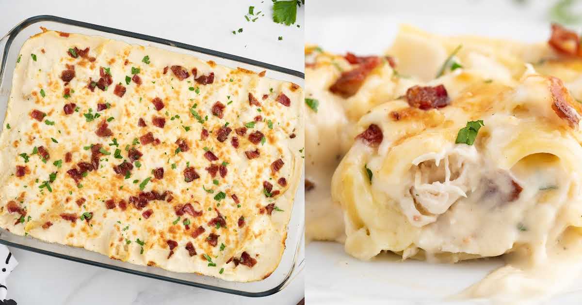 These delicious chicken Alfredo stuffed shells are loaded with chicken, crispy bacon, creamy alfredo sauce, and plenty of melted cheese.