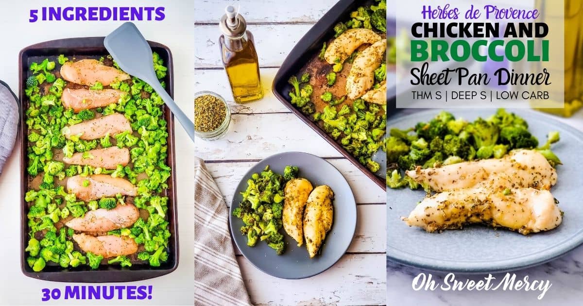 Simple, flavorful, and delicious this easy roasted chicken and broccoli sheet pan dinner is ready in 30 minutes or less. Seasoned with herbes de provence and olive oil, it's a delicious THM S (and Deep S) weekday meal.