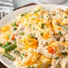 This easy Chicken and Potato Casserole recipe combines tender chicken and creamy potatoes topped with cheese for a satisfying, hearty dinner. A variety of vegetables and seasonings all come together in a rich and flavorful sauce for a delicious, comfort food classic!!