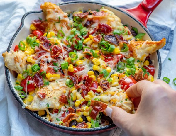 Once all chicken tenders are cooked, arrange them in the skillet as shown, and sprinkle on the toppings: diced tomatoes, corn, black beans, and cheese.