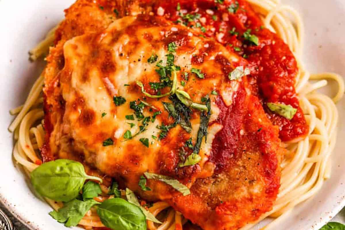 This Chicken Parmesan is made with breaded chicken topped with marinara sauce and melted Parmesan cheese.