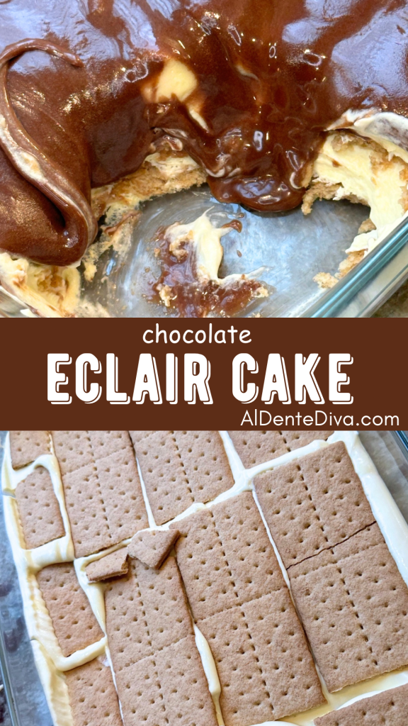 This no bake chocolate eclair cake is made with vanilla instant pudding, and chocolate icing in between layers of graham cracker crust.