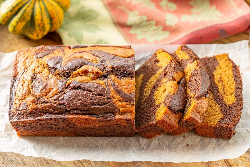 Alternate scoops of the two batters into the bottom of the prepared loaf pan, in the following manner: Create two rows of batter, using three alternating scoops in each row. In the left row, make your first scoop pumpkin, then chocolate, then pumpkin. In the other row, start with chocolate, then pumpkin, then chocolate.Repeat with another alternating layer on top. Lightly swirl the combined batters using a large skewer or knife, creating two figure eights, to marble. Top with coarse sugar, if using.