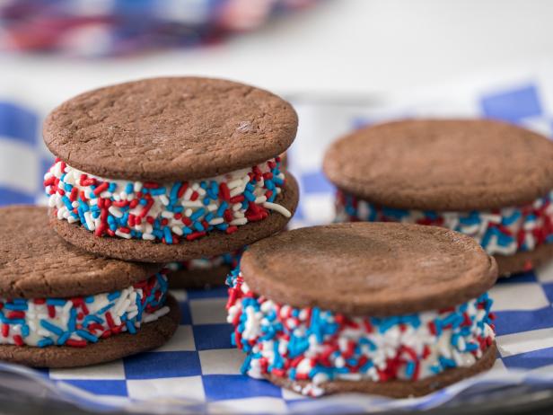 Assemble the cookies: Working quickly, remove the plastic wrap from the ice cream and use a 3-inch cookie cutter to cut out a round of ice cream (lift the plastic wrap from the bottom to help you lift out the round). Sandwich the ice cream between 2 cookies. Sprinkle on red and blue sprinkles along part of the sides and immediately transfer the ice cream sandwich to a plate in the freezer. Repeat with the remaining cookies to make 6 ice cream sandwiches. (The ice cream scraps can be gathered and kept frozen in an airtight container). Freeze the sandwiches until firm enough to serve, 3 to 4 hours.