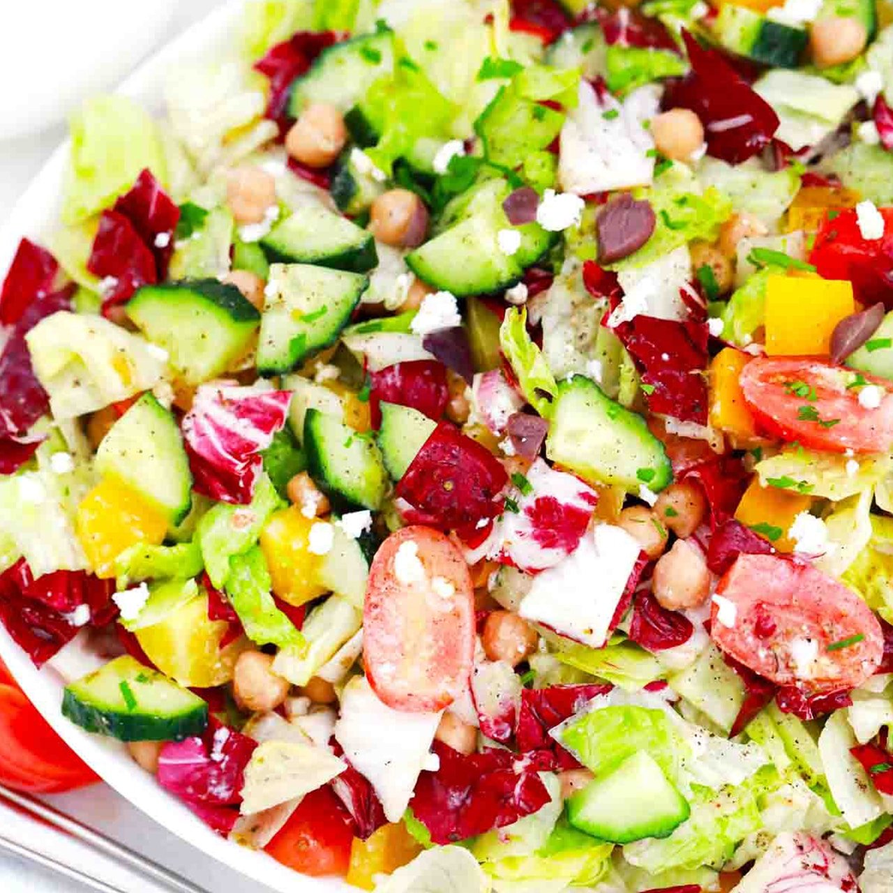 Chopped Mediterranean Salad is a mixture of many delicious fresh ingredients like romaine lettuce hearts, radicchio, olives, and feta cheese coated with red wine vinegarette.