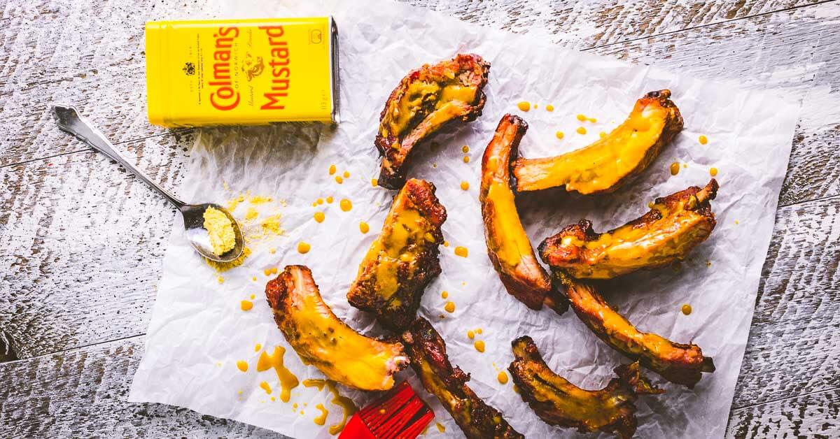 Colman's Mustard rubbed ribs. Smoked baby backs are finished off with a Carolina bbq sauce recipe that is tangy and spicy!