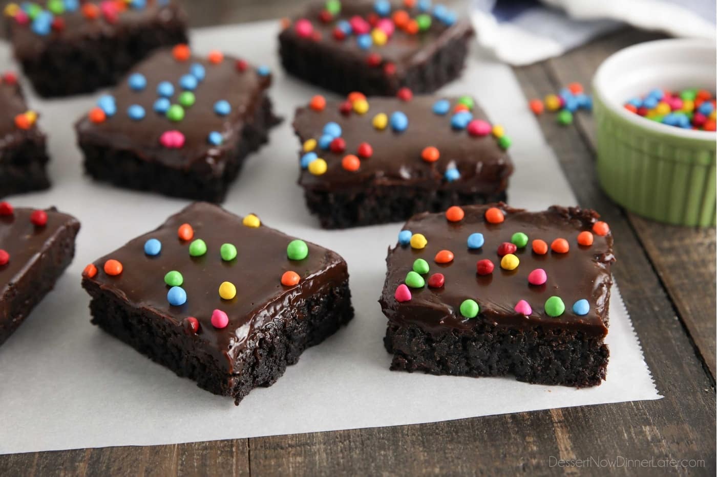 These homemade cosmic brownies are even better than store-bought! Rich, fudgy brownies are topped with a creamy chocolate ganache and candy coated chocolate chips. They’re easy to make from scratch and not just for lunchbox treats!