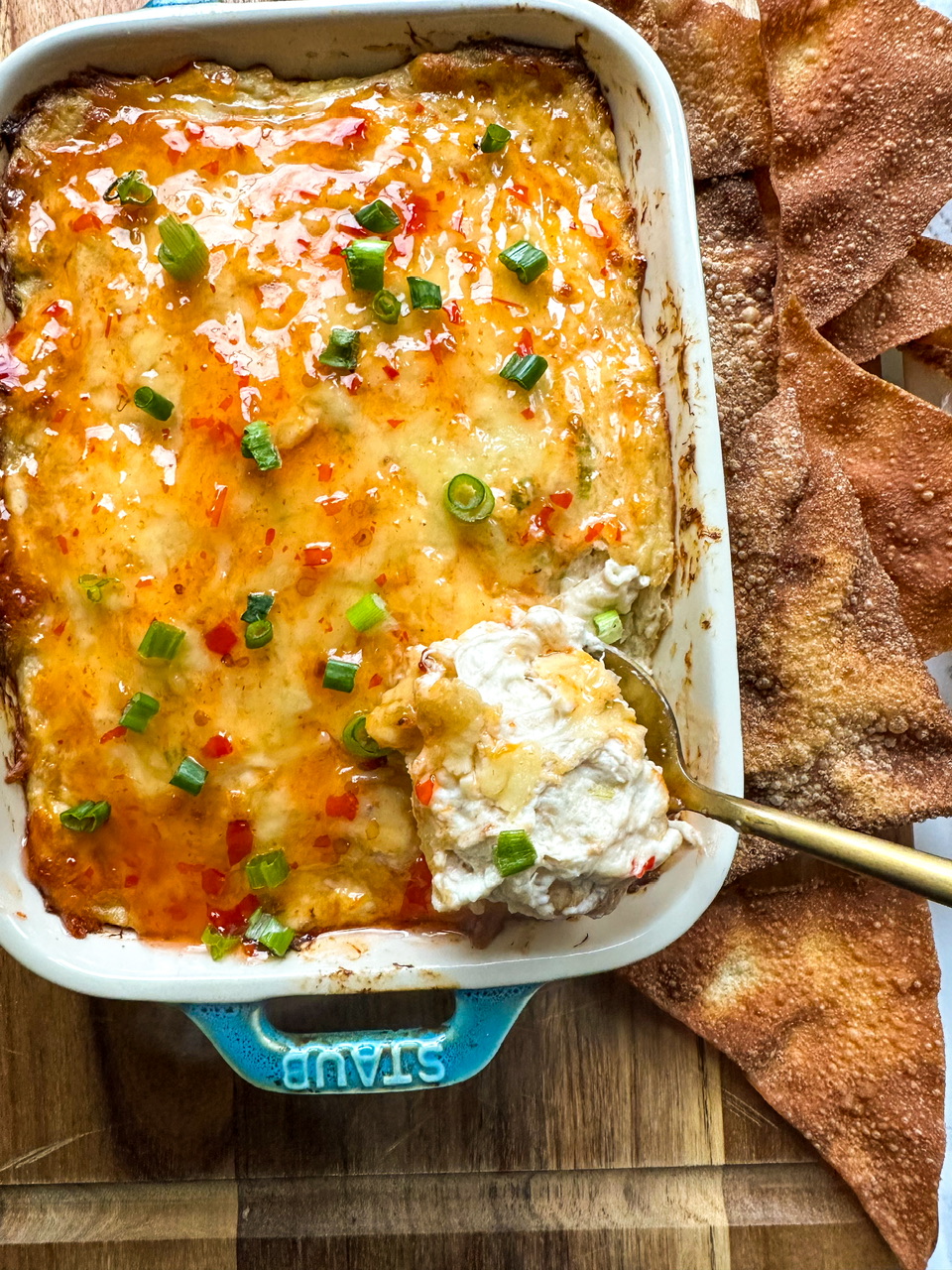 All the delicious flavors of crab rangoon made into a dip and serve with wonton dips to scoop it up.