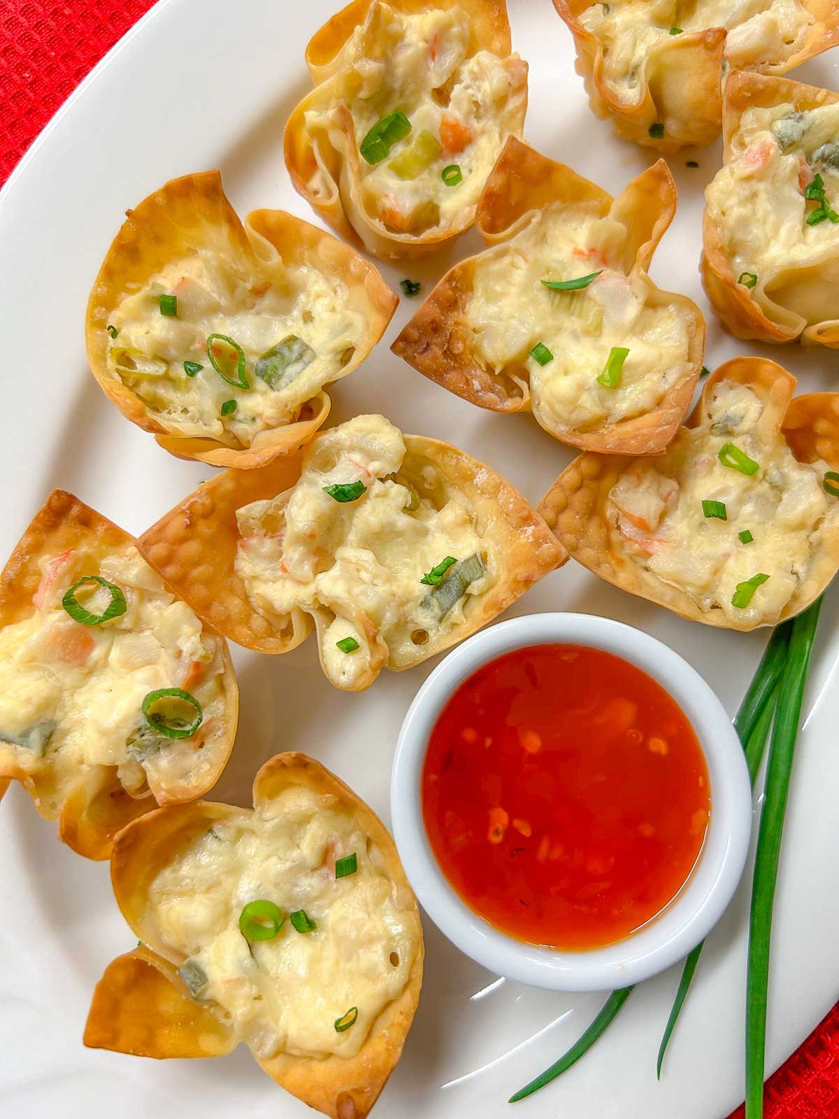 Spoon a heaping tablespoon of filling into each of the wonton cups. Cover the tray with foil and bake until the filling is warmed through and bubbly, about 10-12 minutes.