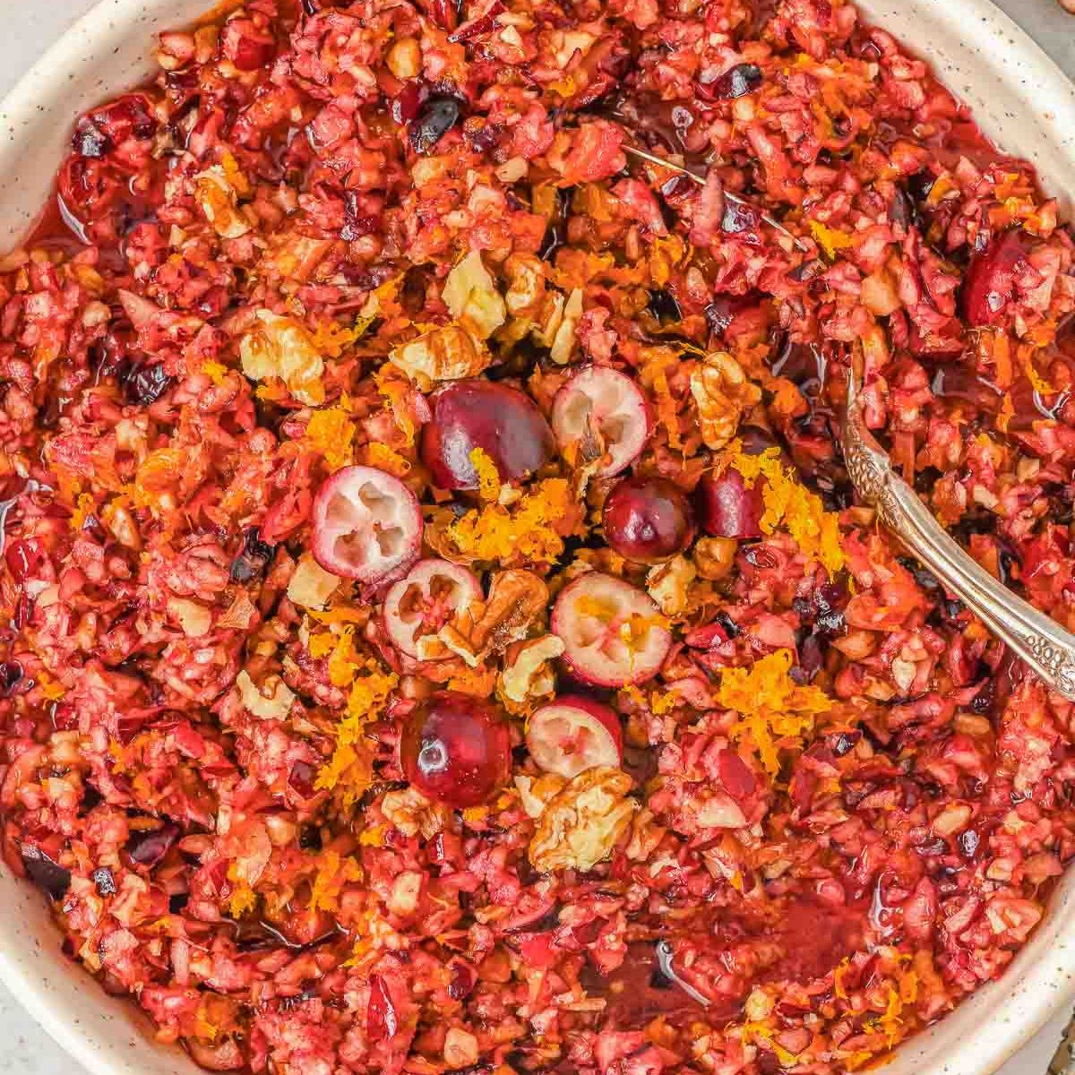 Skip the homemade cranberry sauce and make up this jazzed-up cranberry orange relish instead! This easy dish combines fresh cranberries, citrusy oranges, crunchy walnuts, and warm spices.