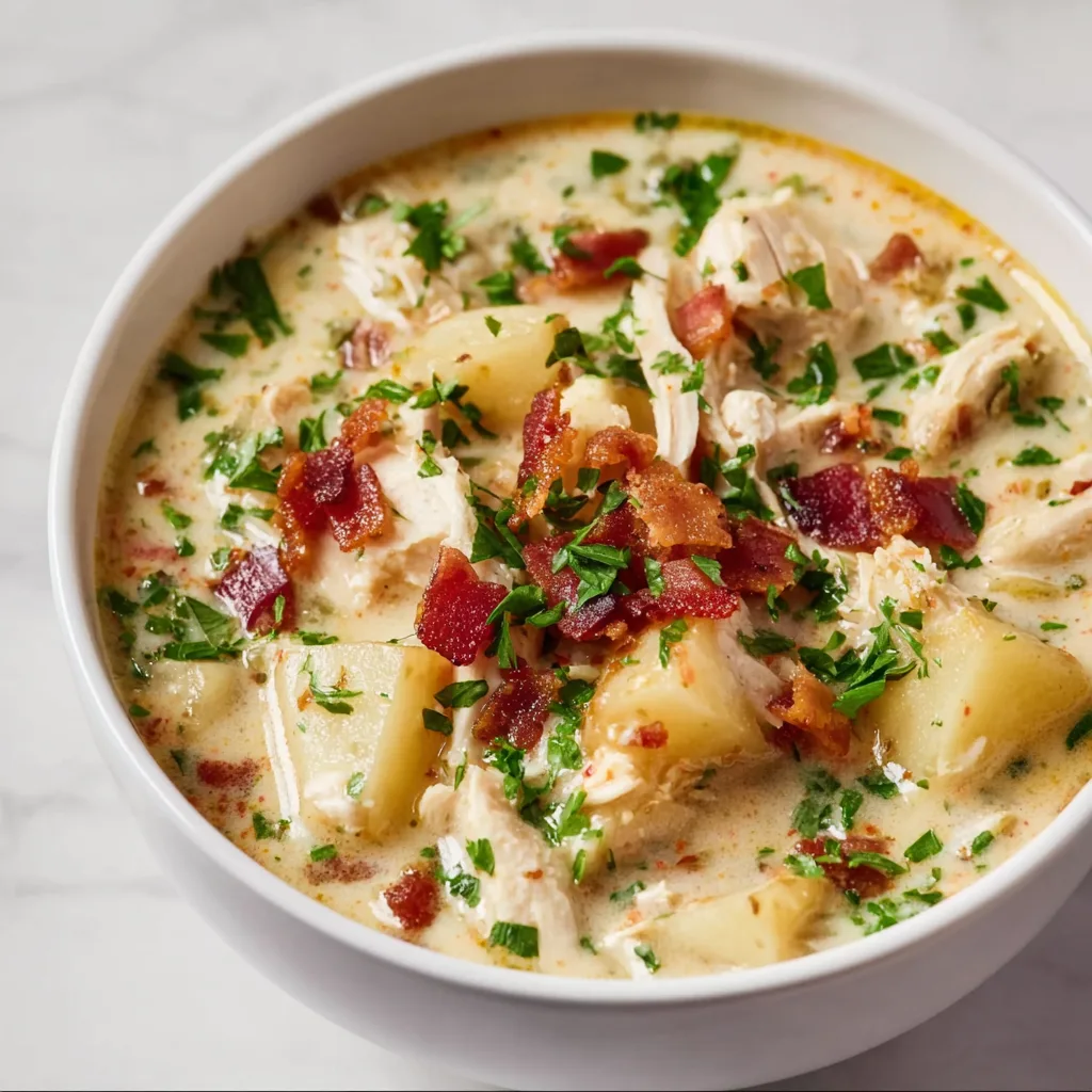 A rich, comforting soup made with tender chicken, soft potatoes, savory vegetables, and crispy bacon in a velvety creamy broth.