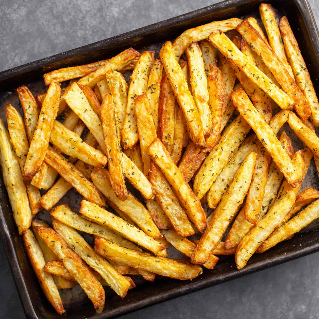 Bake for 20 minutes, then use a spatula to gently flip and rearrange the fries. Return to a single layer and continue baking for 20–25 minutes, tossing once or twice more for even browning.