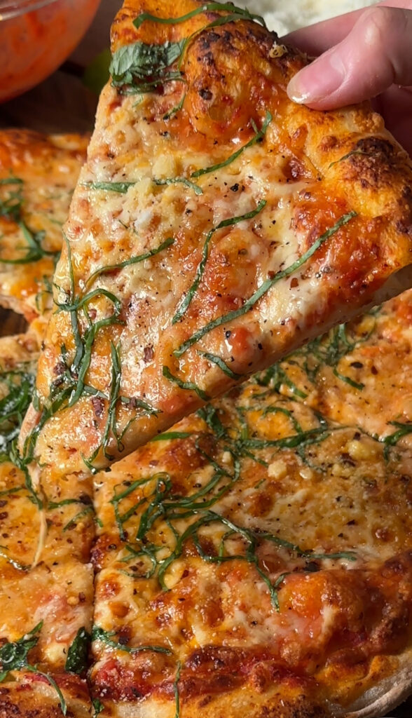 This crispy thin-crust pizza features a perfect blend of three cheeses: sharp pecorino romano, creamy mozzarella, and fresh, milky mozzarella. Baked in a home oven for a golden, crunchy crust, the combination of cheeses melts beautifully, giving you the home-made pizza of your dreams.