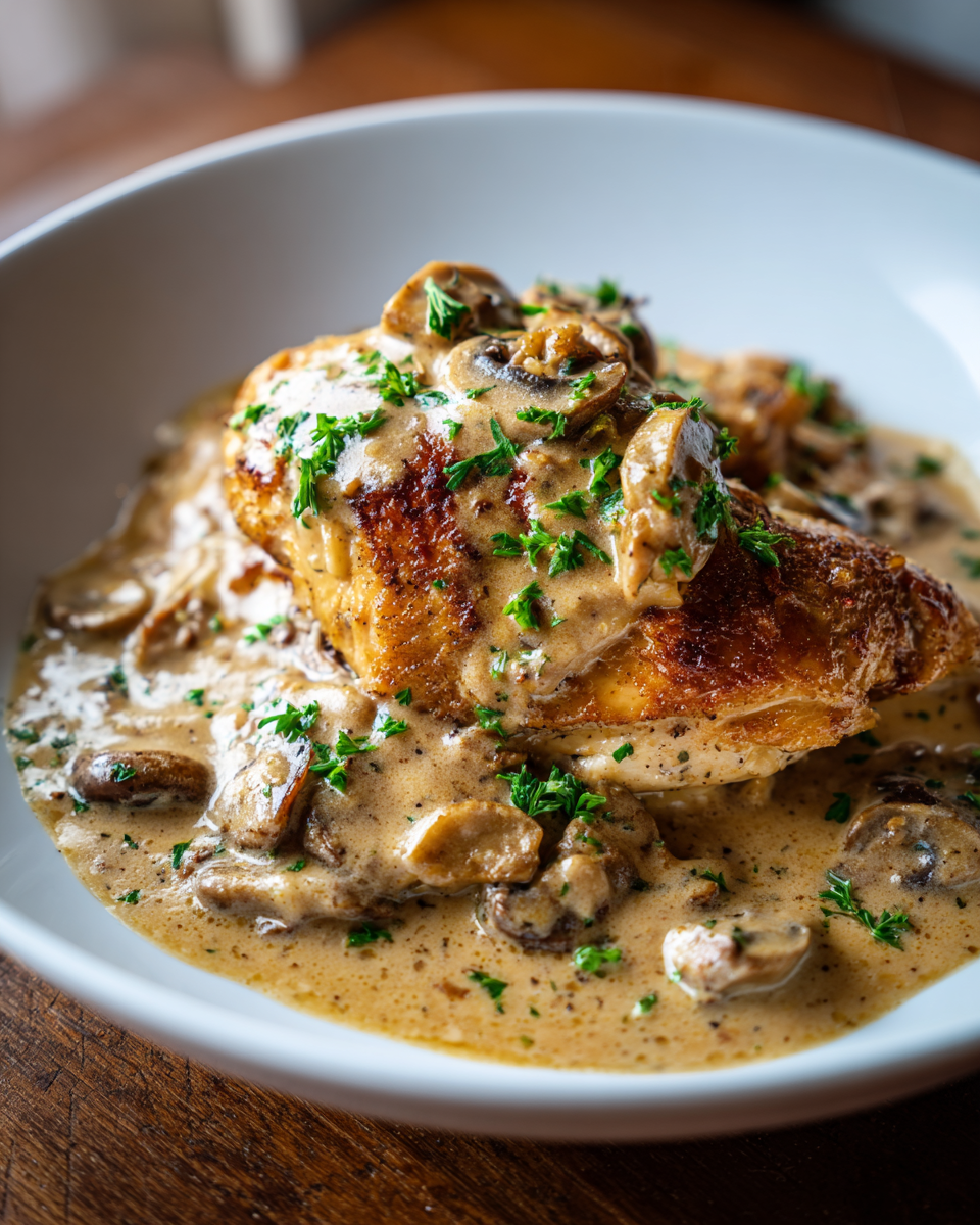 Serve the chicken and gravy over rice or mashed potatoes, and garnish with chopped parsley.
