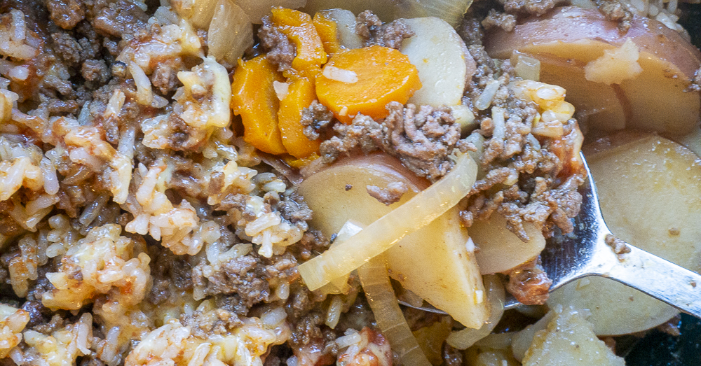 Sprinkle rice over the beef, then mix together tomato soup and 1 1/2 cups of water and pour over the rice.