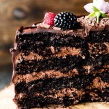 This super moist dark chocolate cake combines unsweetened natural cocoa powder and dark cocoa powder for an extra rich flavor. Fill the cake with a simplified chocolate mousse and cover it with semi-sweet chocolate ganache. If needed, you can prepare the ganache and mousse ahead of time. See notes.