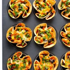Once the tortilla cups are ready, carefully spoon the filling into each cup until it is filled nearly to the brim. Place a pinch of cheese on top of each tortilla cup. Then return the pan to the oven and bake for 15 minutes, or until the cheese is melted and the filling is warmed through.