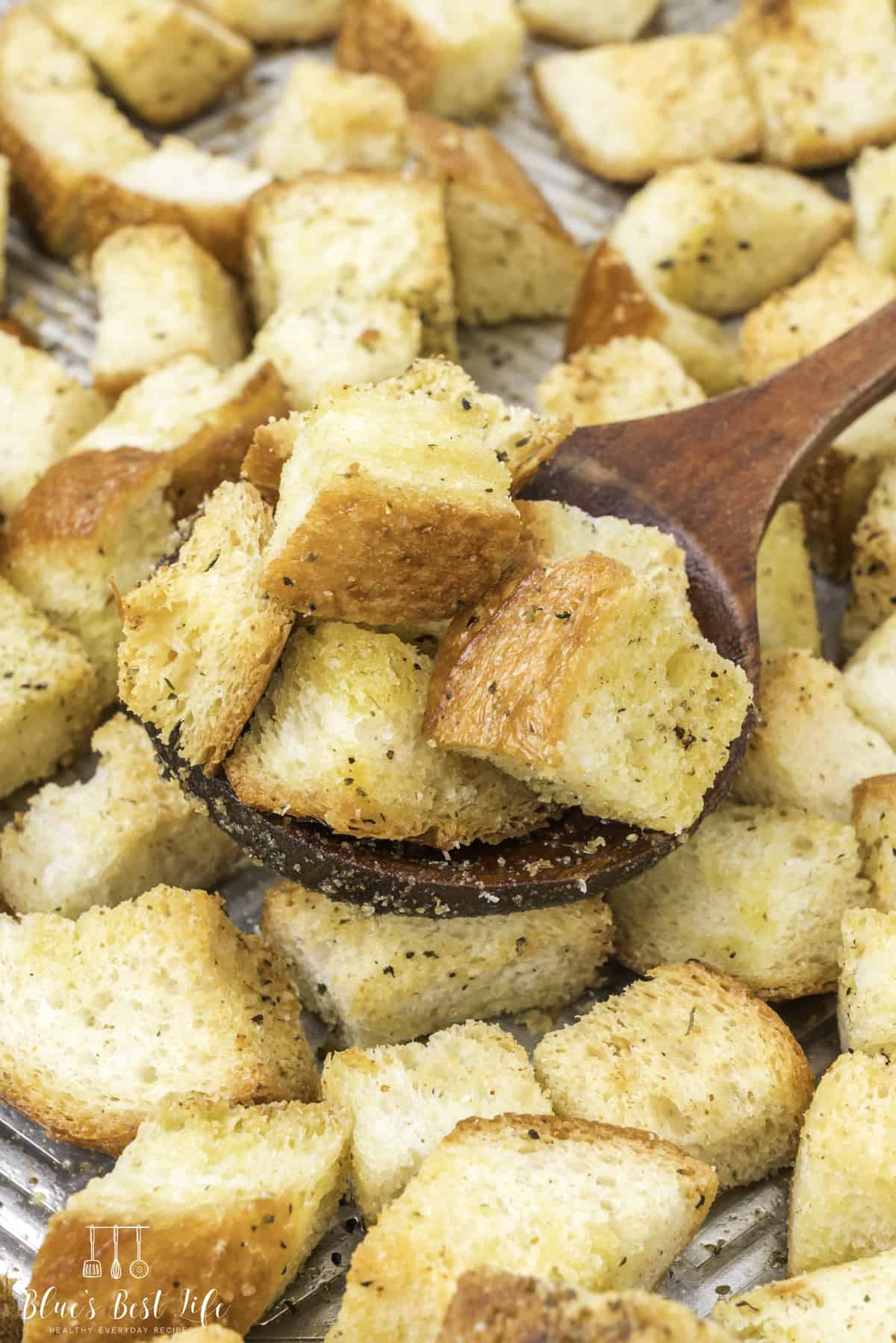 Spread the bread cubes over a rimmed baking tray and drizzle the cubes with remaining olive oil to make sure all bread is well coated.
