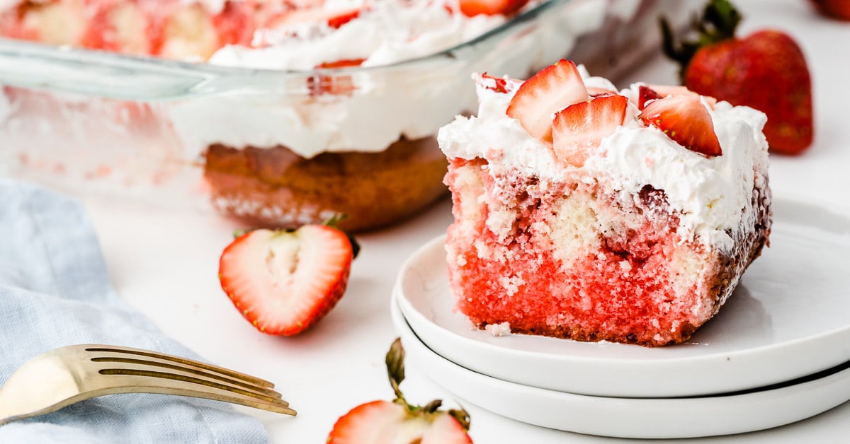 Strawberry Poke Cake is a moist, fresh and fun classic dessert made with a white cake mix, infused with strawberry jello, then topped with a fresh strawberry sauce and whipped topping!