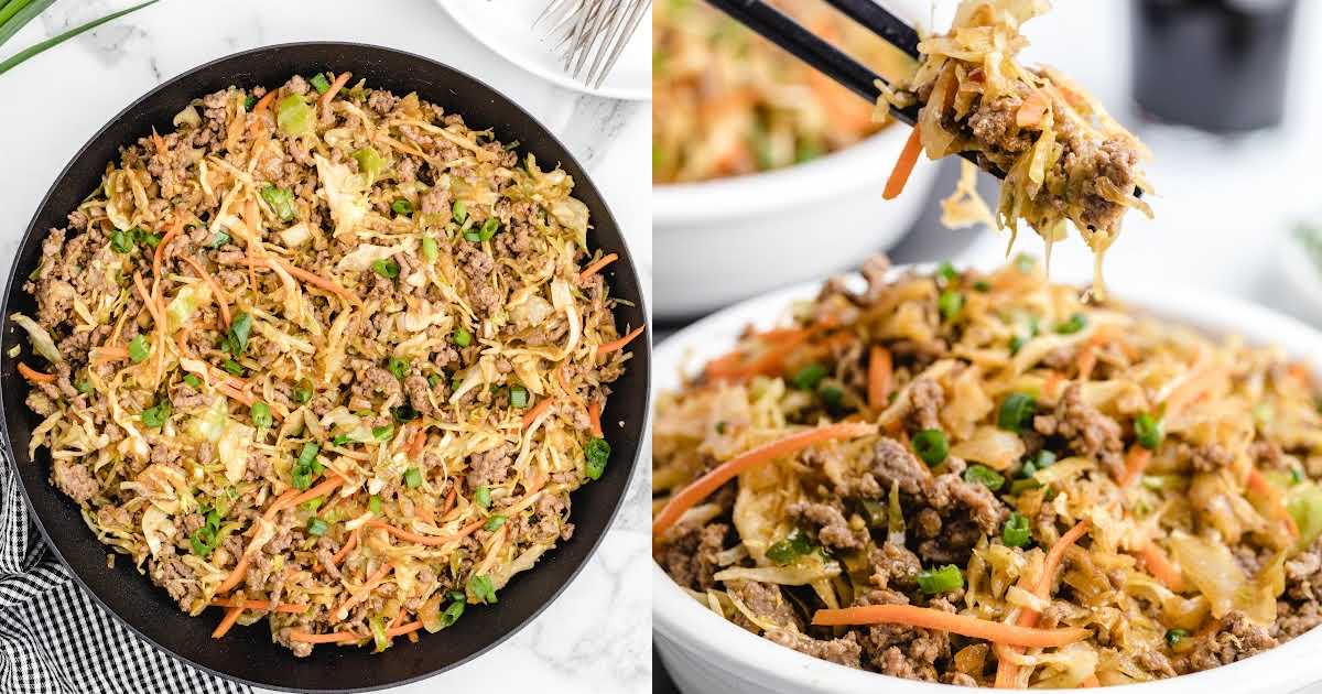 This egg roll in a bowl recipe is a one-pot, Asian-inspired stir-fry with chunks of beef and tender-crisp veggies in a savory, perfectly seasoned sauce.