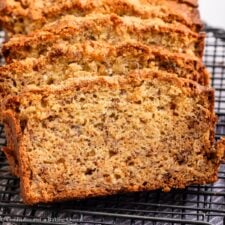 Pour into prepared pan, sprinkle on a tablespoon or two of light brown sugar and bake for 55-65 minutes, or until a knife stuck in the center comes out with no wet batter. For most quick breads, including banana bread, the internal temperature should reach 200°F/93C to 205°F/96°C when it is done cooking. Let the bread cool on a wire rack then invert to cool completely. Store in an airtight container at room temperature for up to 5 days.