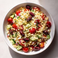 A quick, colorful, and zesty Greek Orzo Salad with fresh vegetables, feta, and a bold vinaigrette.