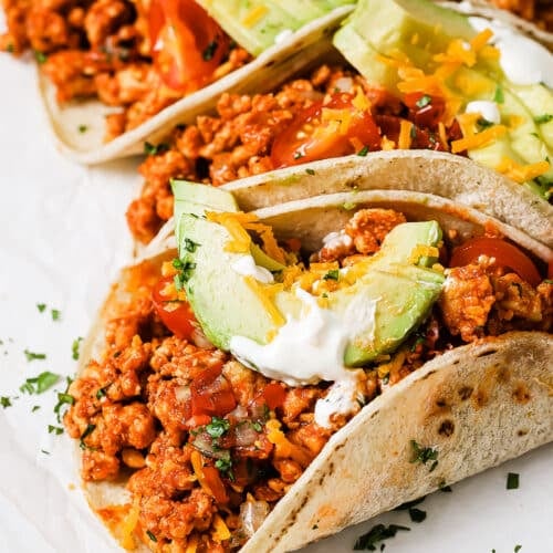 These are the BEST Ground Turkey Tacos packed with flavor from the homemade taco seasoning and ready in just 20 minutes! It’s an easy weeknight recipe that the whole family will love.