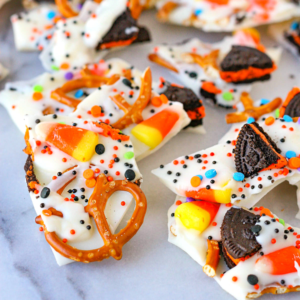 This easy and festive Halloween Bark is the best way to celebrate the spooky season – or any holiday! Use your favorite Halloween candy to make this easy bark and serve it up at movie nights and Halloween parties all season long! This recipe is so easy and customizable that you can make some slight alterations and whip it up for any occasion or holiday – so fun!