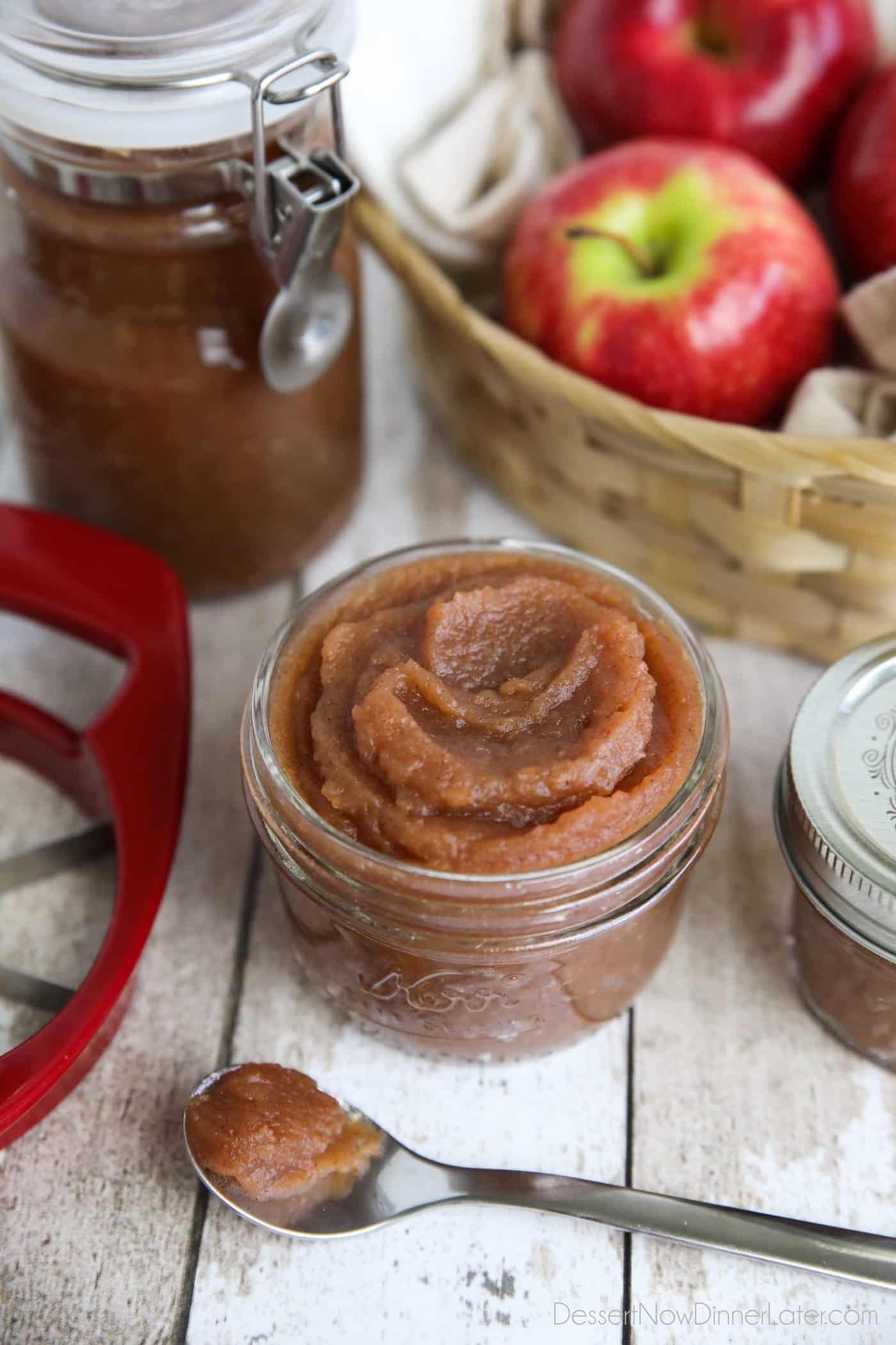 Apple butter is thicker than applesauce with a rich caramelized flavor and warm fragrant spices. It's used as a spread, topping, or snack. This homemade apple butter recipe is easy to make from scratch on the stovetop in as little as two hours.