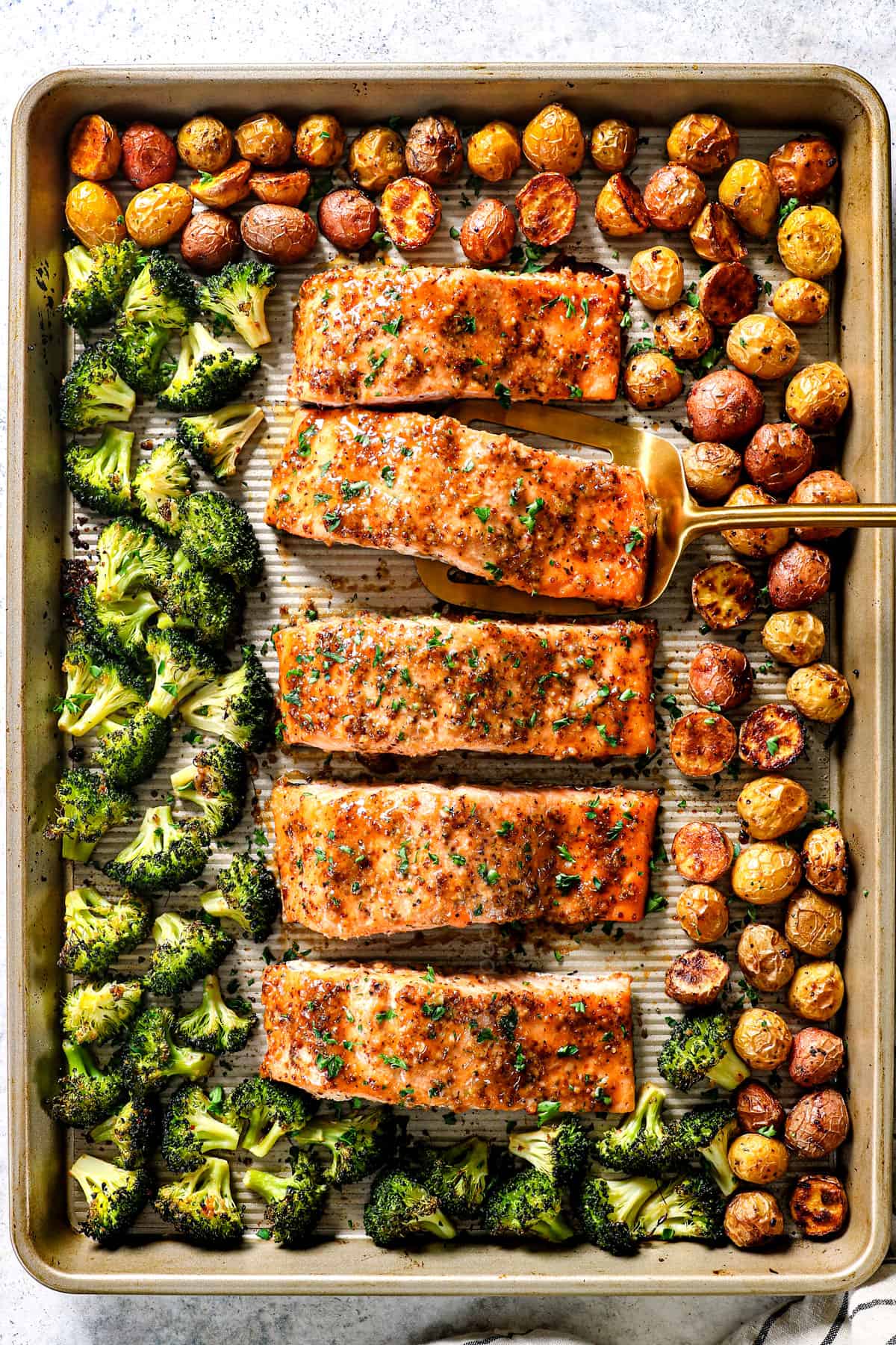 This Honey Mustard Salmon is a versatile, healthy, easy recipe for any night of the week that your whole family will love! The buttery tender, juicy salmon is bathed in a bright, garlicky, zesty honey mustard sauce then baked alongside creamy potatoes and crisp-tender broccoli for the ultimate meal-in-one. This Honey Mustard Salmon can also be made without the sheet pan veggies and served with any of your favorite sides like creamy mashed potatoes and garden salad or in salmon bowls, wraps or salads.