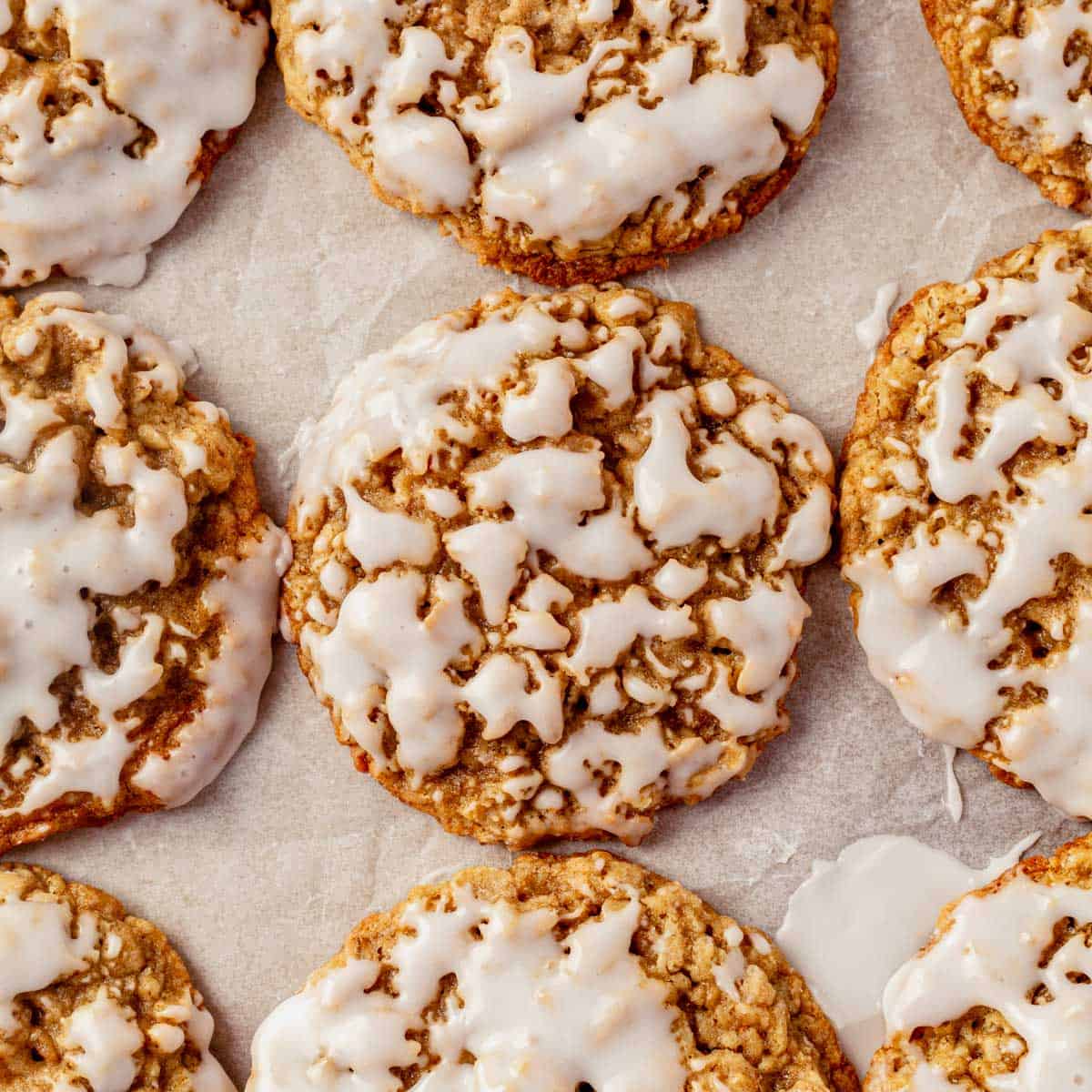 These iced oatmeal cookies have a slightly crispy golden brown edge, a soft center, and just the right amount of chew. And the warm vanilla icing on top adds just the right amount of extra sweetness.