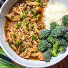 Add in the arrowroot water mixture and set the instant pot to “sauté”. Stir to mix in the arrowroot and let the sauce come to a simmer to thicken. While it’s thickening, shred the chicken thighs using two forks and add the shredded chicken back into the instant pot.