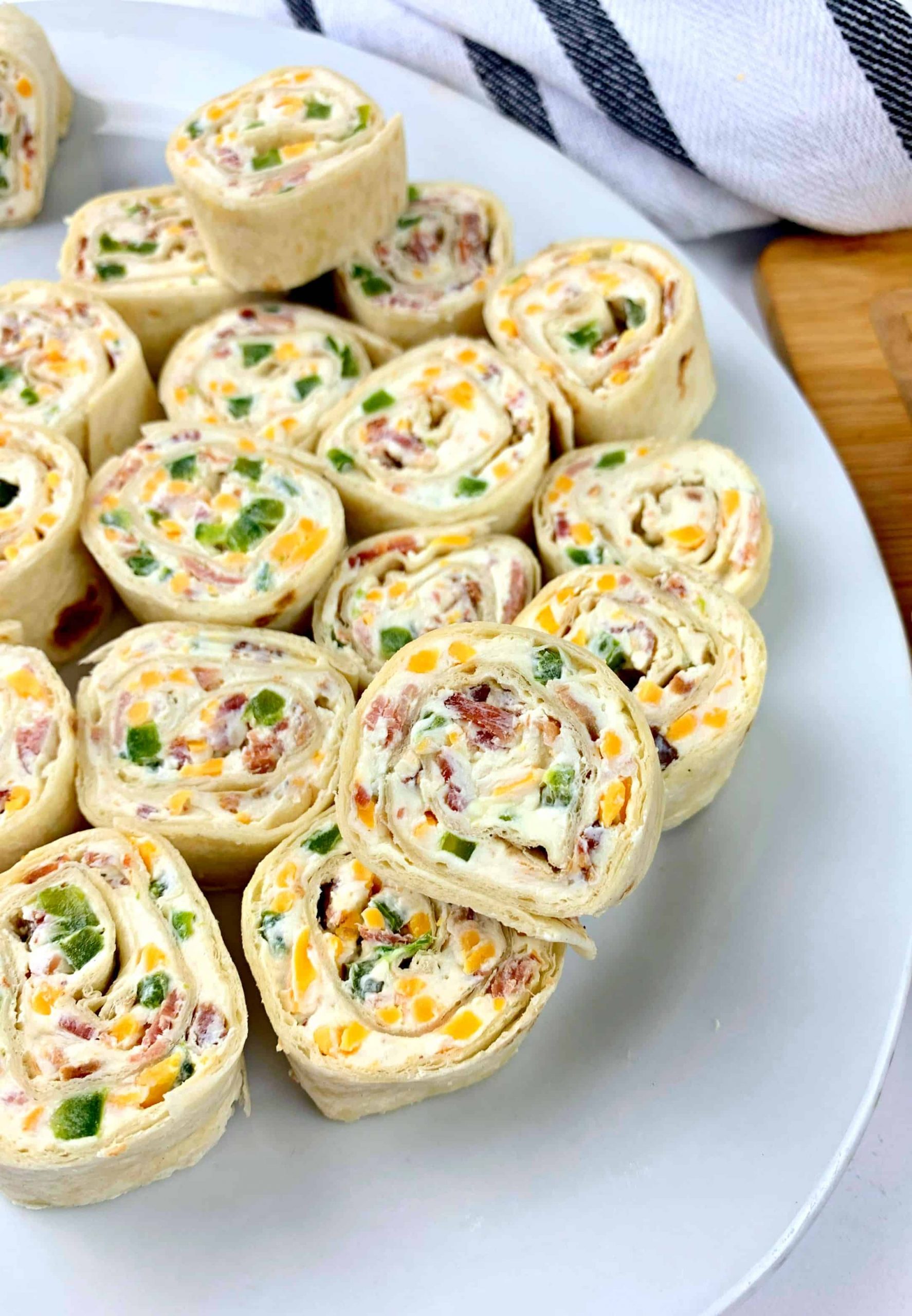 Tightly roll the tortilla from one end to another. Wrap in plastic wrap and place in the fridge overnight or for at least 1-2 hours. In a pinch, you can skip this step, but they will be a bit more difficult to cut evenly.