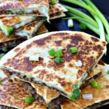 In a clean skillet, add another coating of cooking spray and lay one tortilla down in the center of the skillet. Add an even layer of beef (about 3/4 cup) then cover with 3/4 c. mozzarella and then 2 T. scallions.